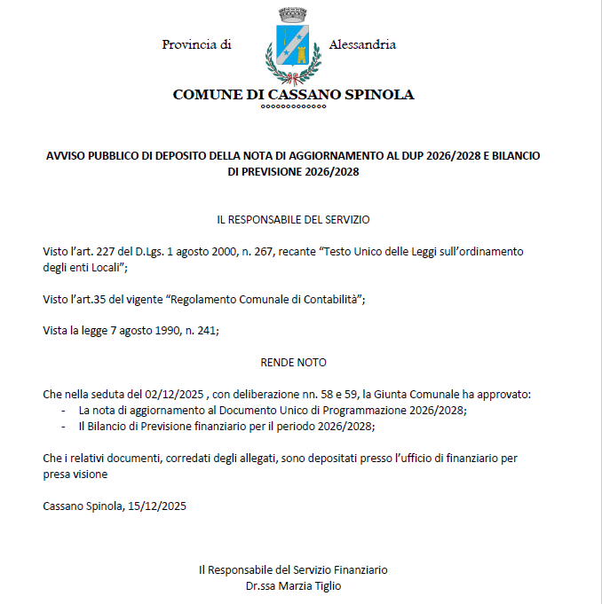 Avviso di deposito nota di aggiornamento al DUP 2026/2028 e Bilancio di previsione 2026/2028