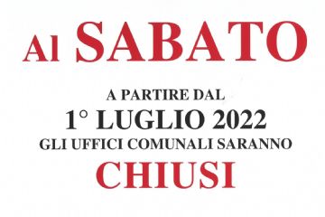 Si informa che a partire dal 1 luglio 2022 gli uffici comunali resteranno chiusi al SABATO