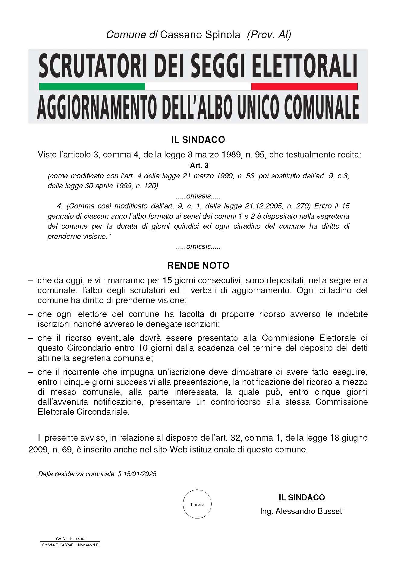 – che da oggi, e vi rimarranno per 15 giorni consecutivi, sono depositati, nella segreteriacomunale: l’albo degli scrutatori ed i verbali di aggiornamento. Ogni cittadino del comune ha diritto di prenderne visione;